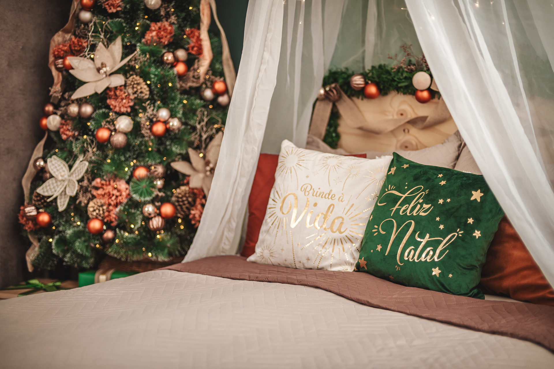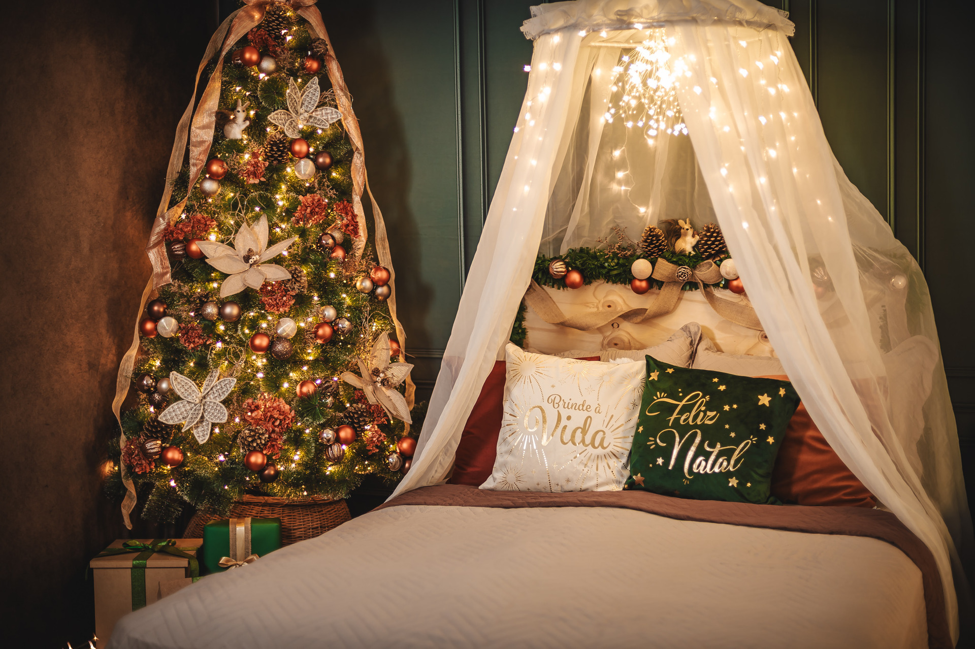 A árvore de Natal, ricamente decorada em tons de dourado, cobre e verde profundo, traz o brilho tradicional da época — mas de um jeito mais sofisticado, remetendo ao luxo discreto das celebrações em família. Ao lado dela, a cama centralizada convida ao aconchego: roupas de cama em tons terrosos suavizam a luz e criam um clima de refúgio, daqueles em que a gente respira fundo e se sente em casa.