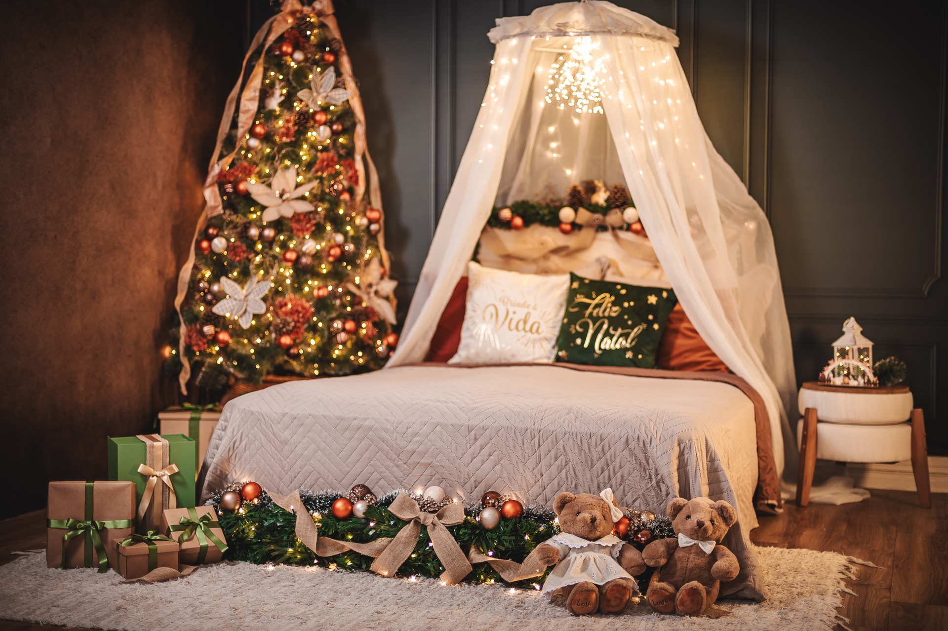 O dossel iluminado, com suas luzes pendentes e delicadas, parece envolver quem entra no ambiente, criando uma atmosfera de sonho. É como se pequenas estrelas descessem para iluminar o momento, trazendo um toque mágico à composição. A cabeceira decorada com verdes naturais e bolas natalinas reforça o charme do tema, integrando o clássico e o contemporâneo de forma harmoniosa.