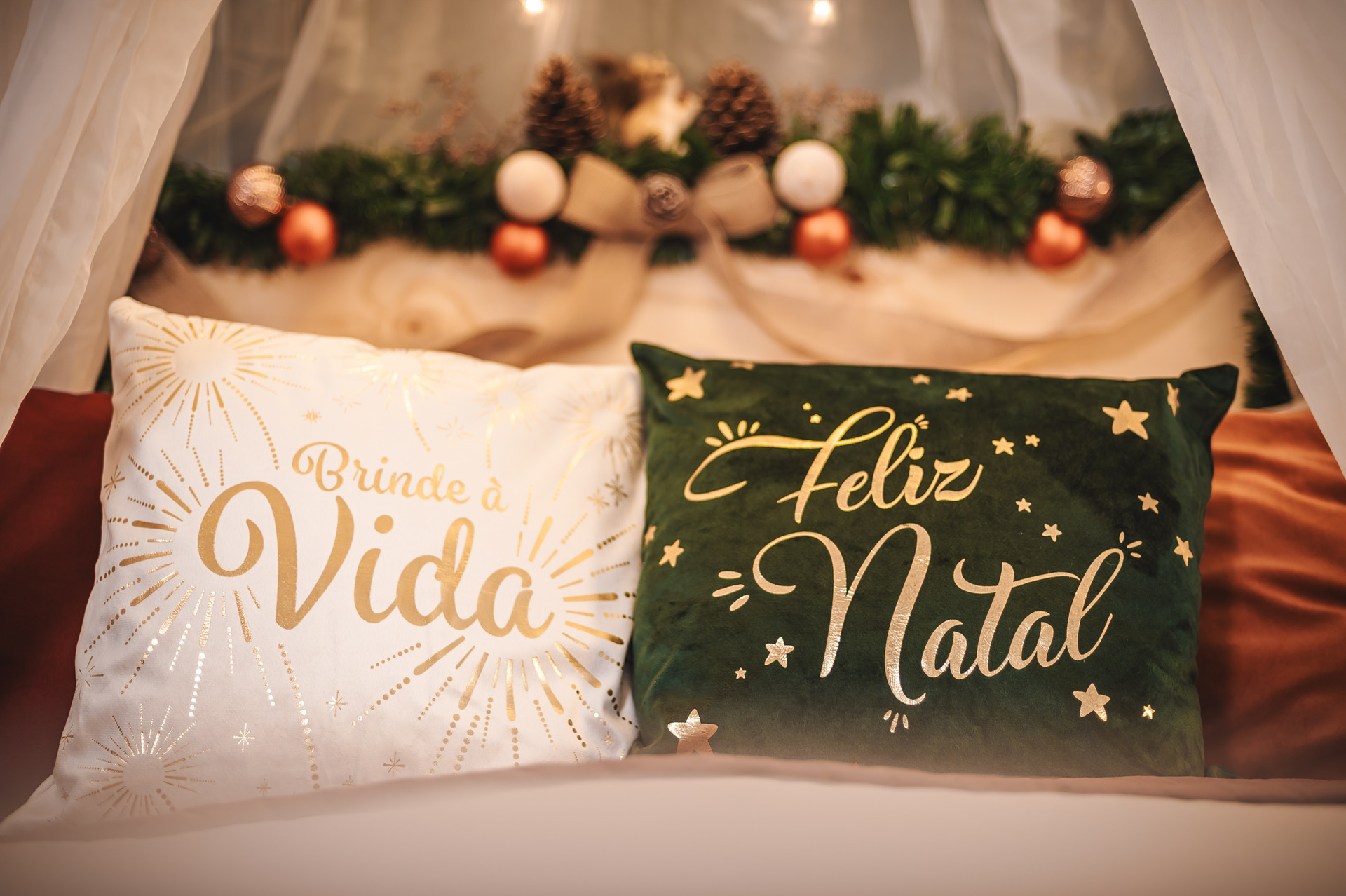 As cores em tons terrosos foram escolhidas para trazer calma e sentimentos que conversam com o brilho quente das luzes — equilibrando o elegante com o afetivo. Cada detalhe, desde a textura da manta até as almofadas com frases natalinas, foi disposto para trazer sensação de paz, calor humano e um toque de poesia à experiência.