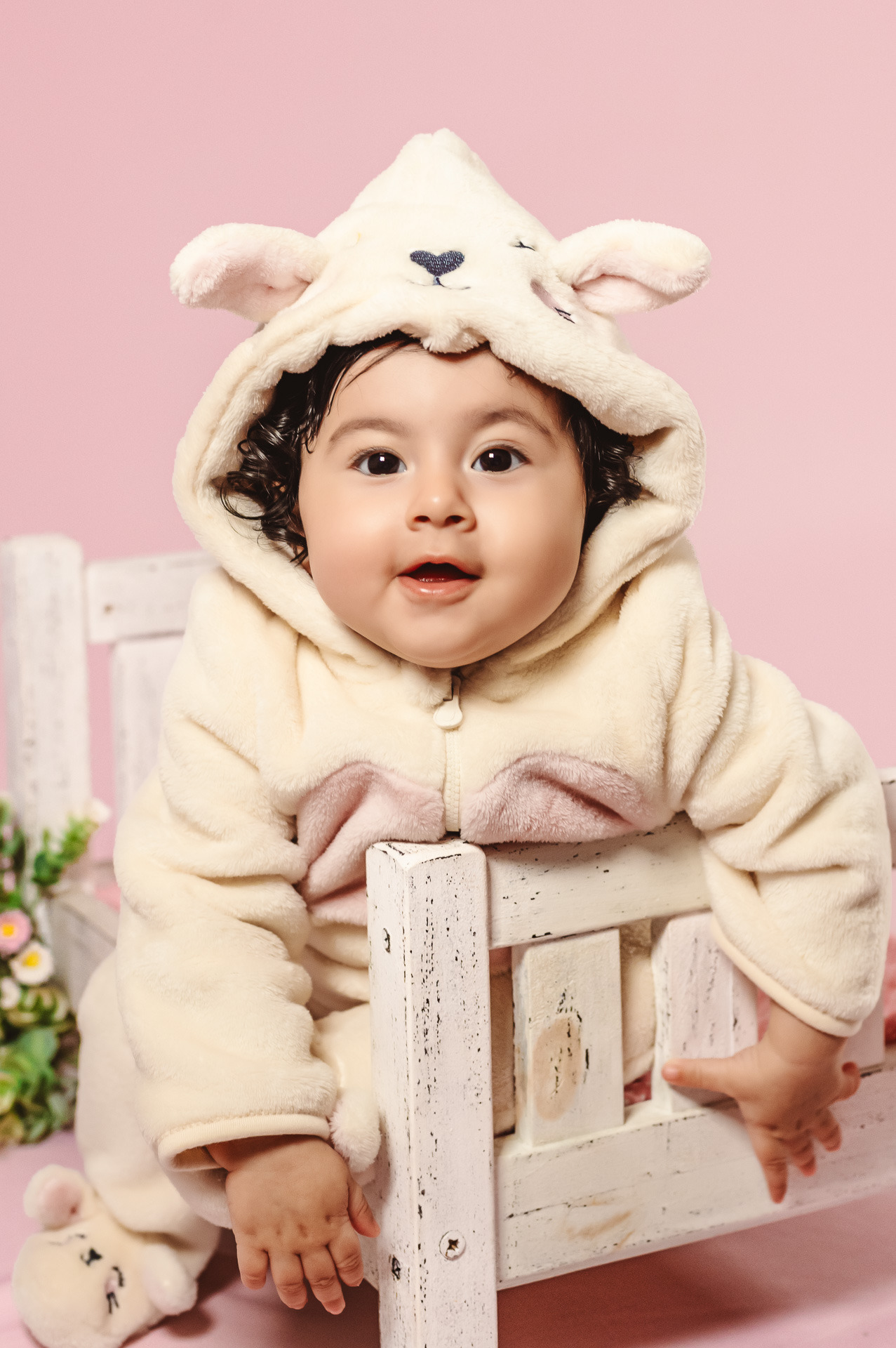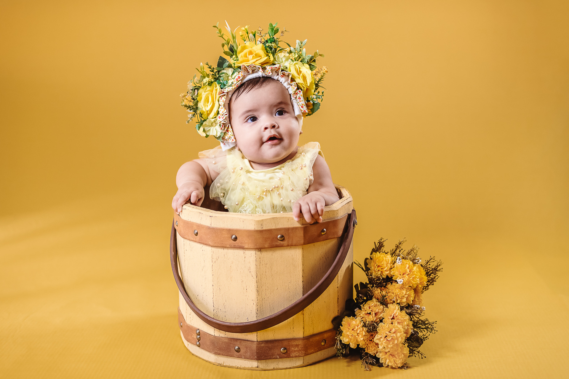 Ensaio feito no estúdio, com fundo liso e uma produção simples, para destacar o bebê e as expressões dessa fase: risos, caretas, pequenas conquistas (sentar, engatinhar, ficar em pé).