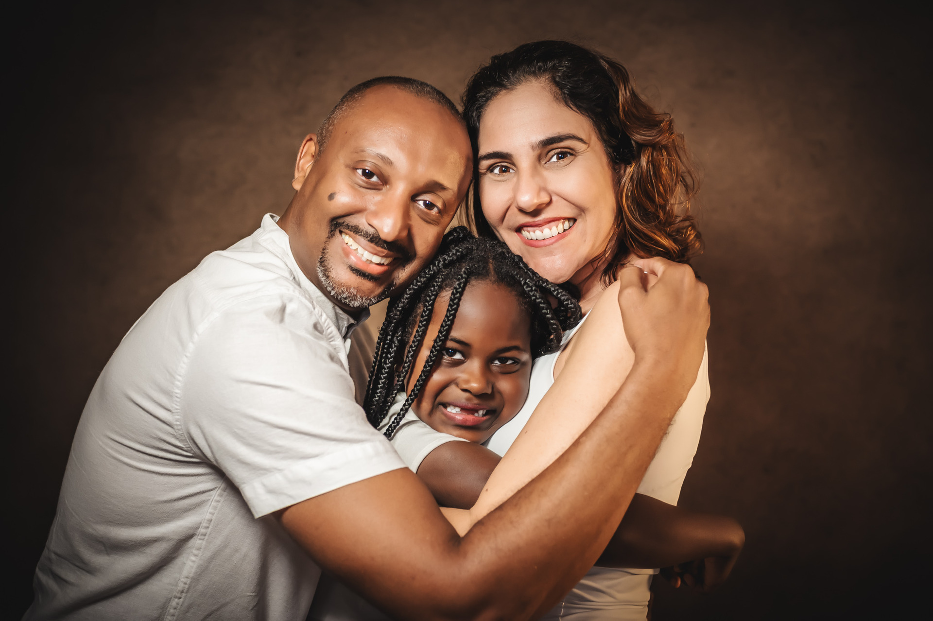 Para a família que quer uma foto que nunca envelhece. Fundo liso, luz pensada e toda a atenção no vínculo entre vocês.